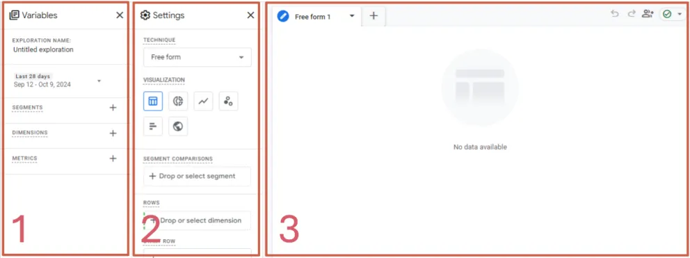 From left to right, the Variables (1) panel enables you to name your exploration, select a date range for the data shown, and add the segments, dimensions and metric fields that will make up your reports. Ensure to make the name of your exploration representative, for future reference, and set your date range as intended. Note that date ranges cannot be changed by users viewing shared reports, only the user who owns the report.